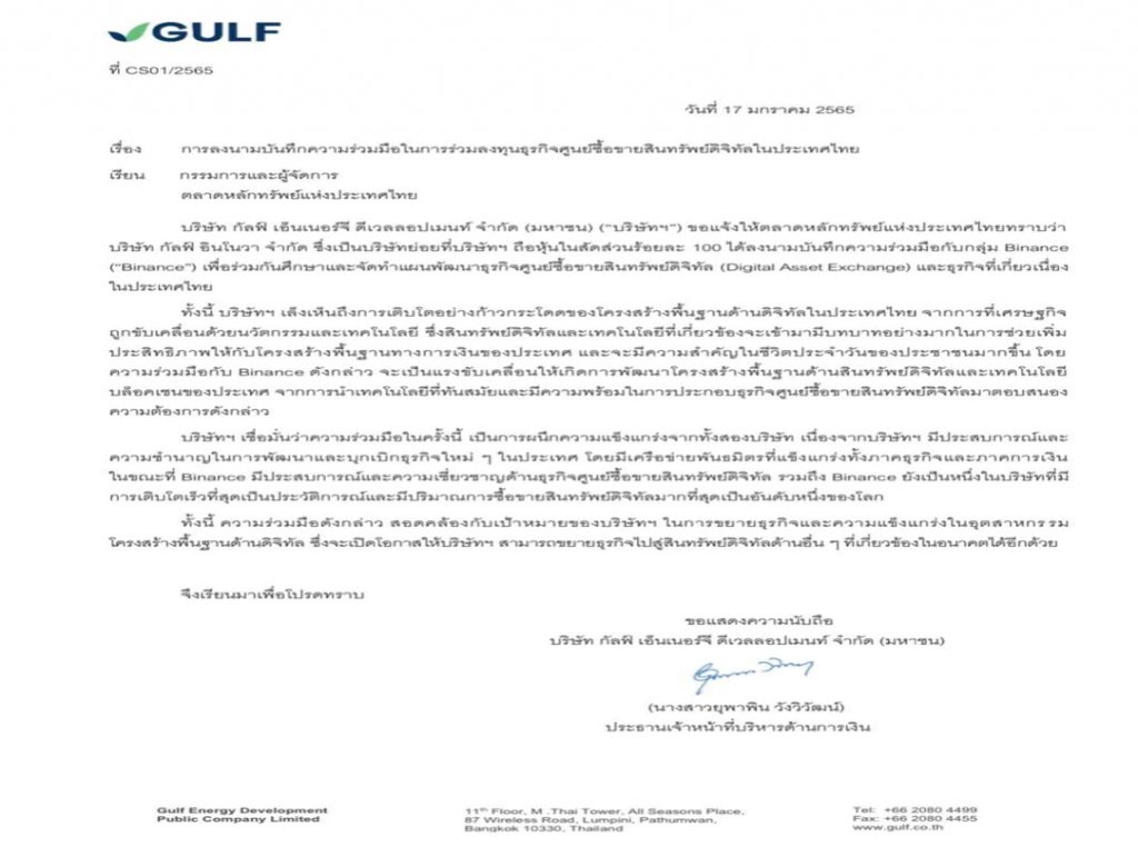 นางสาวยุพาพิน วังวิวัฒน์ ประธานเจ้าหน้าที่บริหารด้านการเงิน บริษัท กัลฟ์ เอ็นเนอร์จี ดีเวลลอปเมนท์ จำกัด (มหาชน) หรือ GULF เปิดเผยว่า บริษัทขอแจ้งให้ตลาดหลักทรัพย์แห่งประเทศไทยทราบว่า บริษัท กัลฟ์ อินโนวา จำกัด ซึ่งเป็นบริษัทย่อยที่บริษัทฯ ถือหุ้นในสัดส่วนร้อยละ 100 ได้ลงนามบันทึกความร่วมมือกับกลุ่ม Binance (“Binance”) เพื่อร่วมกันศึกษาและจัดทำแผนพัฒนาธุรกิจศูนย์ซื้อขายสินทรัพย์ดิจิทัล (Digital Asset Exchange) และธุรกิจที่เกี่ยวเนื่องในประเทศไทย