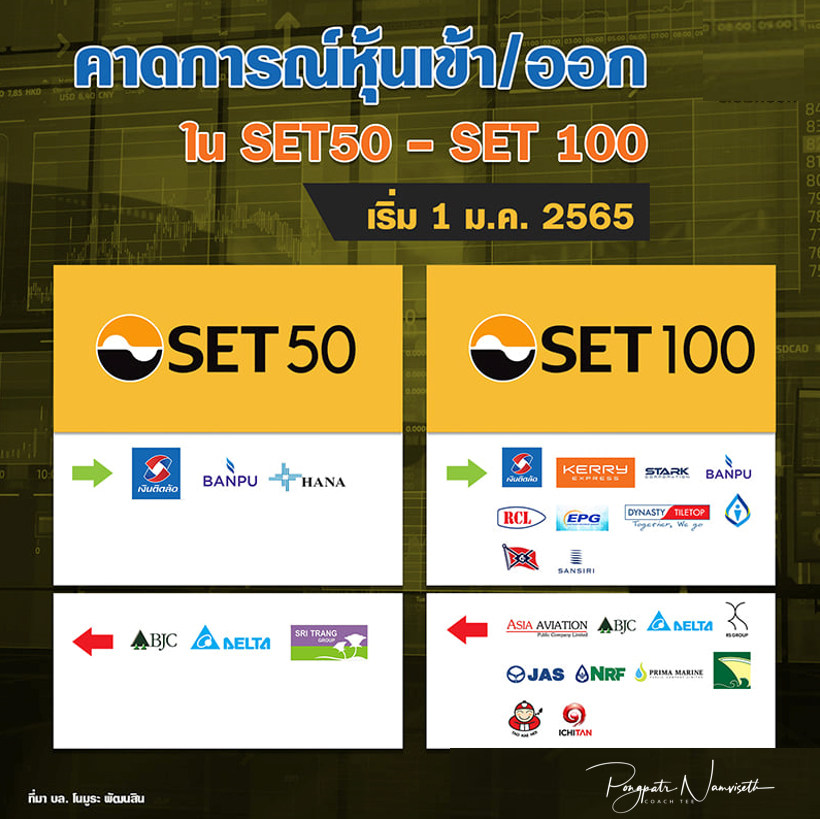 บล.โนมูระ ส่อง 3 หุ้นใหม่ติดโผ SET50 นำโดย TIDLOR, BANPU, HANA ส่วนหุ้นที่หลุด BJC, DELTA, STAขณะที่ กลุ่ม SET 100 มี 10 บริษัทเข้า/ออก ฝั่งตลาดหลักทรัพย์เตรียมประกาศกลางธ.ค.นี้ และเริ่มมีผลตั้งแต่วันที่ 1 ม.ค.65มีผลกับการที่นักวิเคราะห์หรือโบรกจะนำมาวิเคราะห์และมีผลกับด้านจิตวิทยานะ ใครถือตัวที่หลุดSETก็อาจใจหวิวๆหน่อย ยิ่งถ้ากองทุนมีการปรับพอร์ตคัดหุ้นนอกSETออก ส่วนใครถือตัวที่จะเข้าSETก็น่าจะมีแรงซื้อเข้ามาให้อุ่นใจนิดนึง