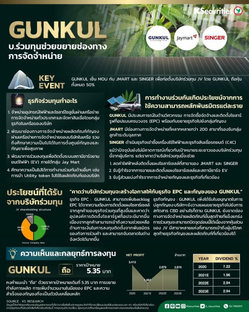 สำหรับการร่วมมือกันระหว่าง บริษัท เจ มาร์ท จำกัด (มหาชน) หรือ JMART กับ บริษัท กันกุลเอ็นจิเนียริ่ง จำกัด (มหาชน) หรือ GUNKUL และ บริษัท ซิงเกอร์ประเทศไทย จำกัด (มหาชน) หรือ SINGER นั้น นายกิตติพงศ์ กล่าวว่า การจัดตั้งบริษัทร่วมทุนในครั้งนี้เพื่อจัดจำหน่ายอุปกรณ์ไฟฟ้า และ โซลาร์โซลูชั่น การจัดหาสินเชื่อ พัฒนาช่องทางการจัดจำหน่ายผลิตภัณฑ์กัญชง และ ลงทุนติดตั้งระบบ Solar Rooftop โดยคาดว่าการจัดตั้งจะแล้วเสร็จต้นปีหน้า และ เบื้องต้นจะขยายไปยังร้านค้าที่มีอยู่จำนวน 100,000 ร้านค้า ซึ่งจะเน้นไปพื้นที่ภาคเหนือ กลาง อีสาน และ ตะวันออก